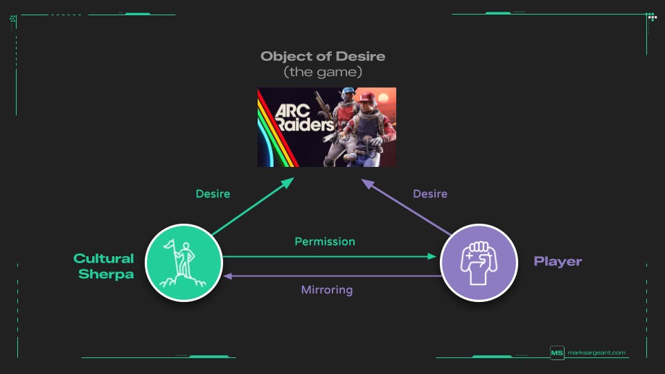 The underpinning psychology is that players, particularly those that are still young and growing into the world, do not truly know what they want. Instead, they imitate the desire of others. While we won't readily admit it, we rarely desire something for its inherent, intrinsic value. Rather, we assign value to games because we see other people wanting to play them. Instead of a straight line between a player and the game, desire is triangular, involving a player, their Sherpa, and the game itself.