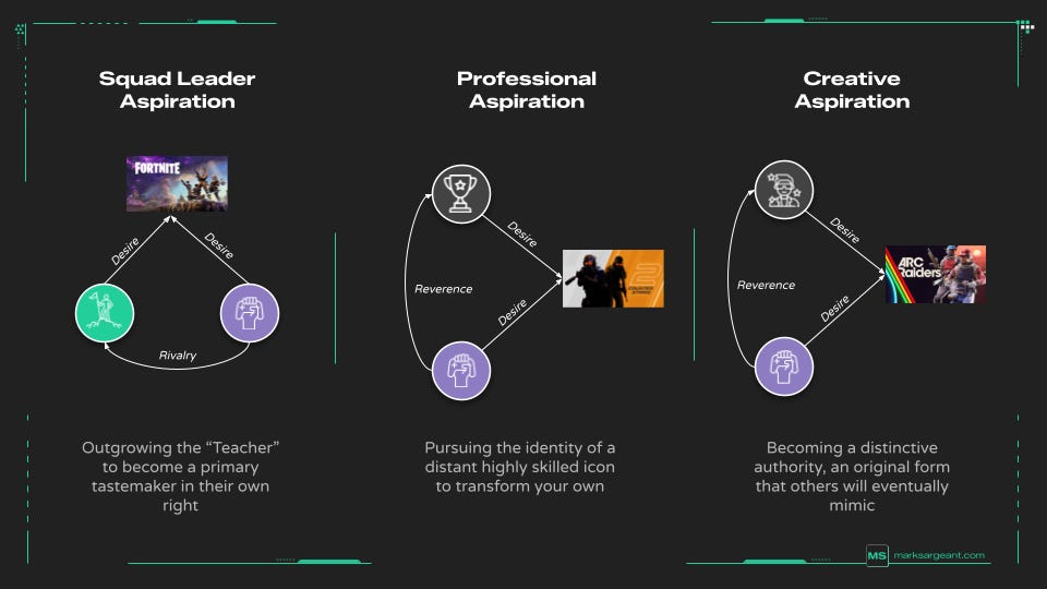 This type of thinking requires us not only to examine what a player needs, but who they want to become. Most of my observations are with a focus on publishing to those under 21 years old, and largely stem from the teachings of Rene Girard’s Mimetic Theory, and conversations with my colleague Chris Tom, who made me think more deeply about this topic.