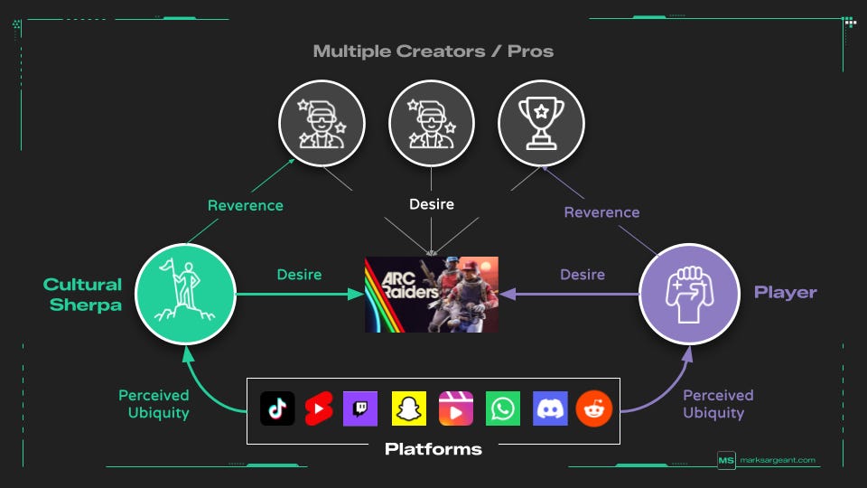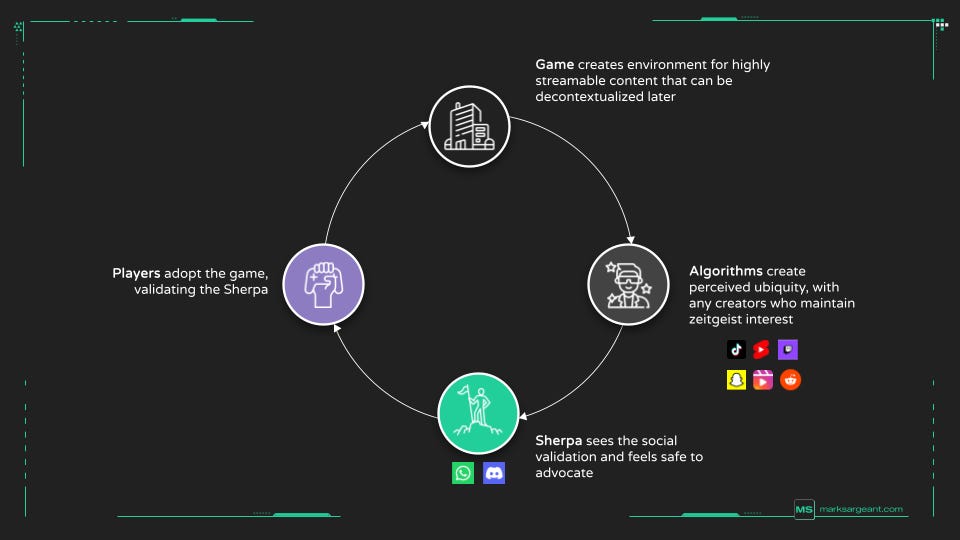 Because of this risk, the Sherpa is rarely a true early adopter in total isolation. They are looking for a safety net. They need to feel that if they lead their friends into this new world, they won’t be left standing there alone. If they’re going to climb that mountain, they’re gonna want to know that it’s going to be worth it. Perceived ubiquity is what gives them this confidence. If your game is perceived as having velocity, durability, and watchability, particularly through easy-to-share short form content, then the algorithm and buzz on all the platforms gives them the “cover fire” they need to convince the group.